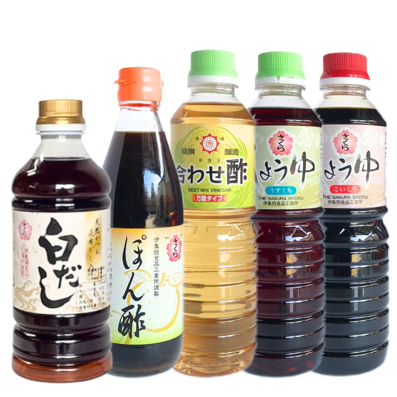 淡口醤油、濃口醤油、合わせ酢、白だし、めんつゆの5本セットです。