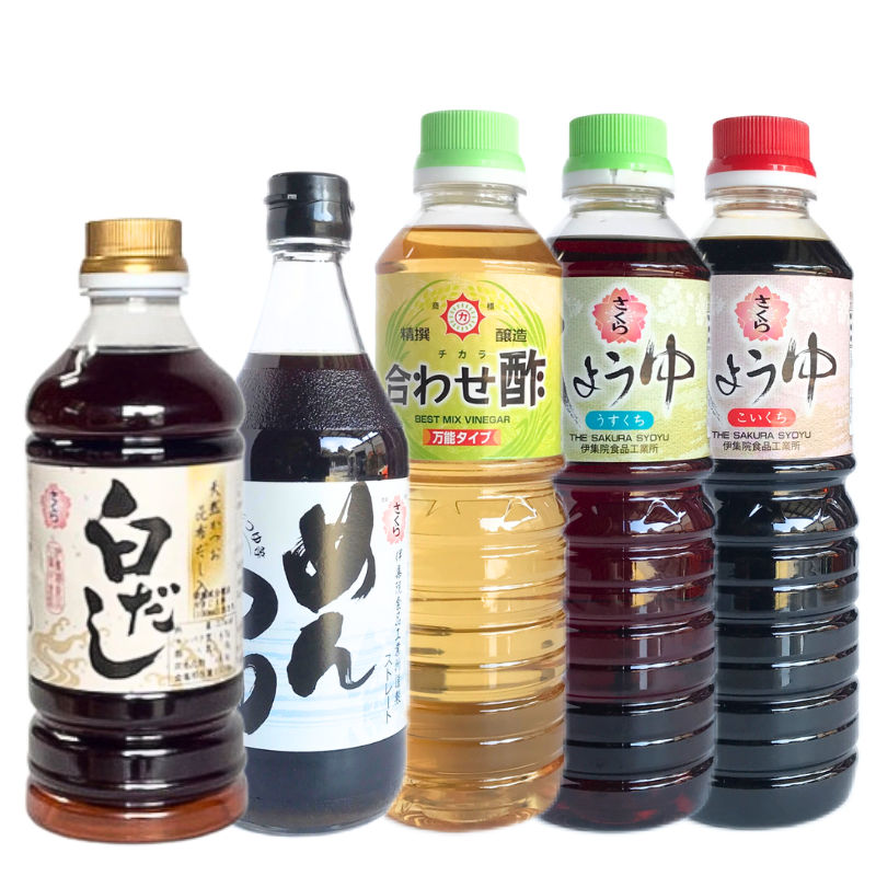 淡口醤油、濃口醤油、合わせ酢、白だし、めんつゆの5本セットです。