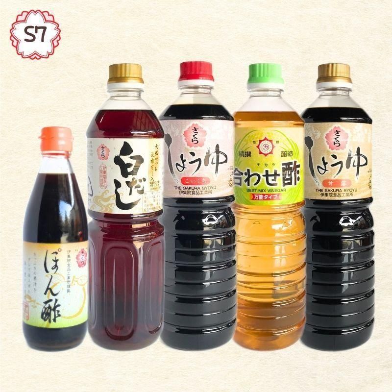 濃口醤油 1L×1本、甘露醤油 1L×1本、合わせ酢 1L×1本、白だし 1L×1本、ぽん酢 360ml×1本